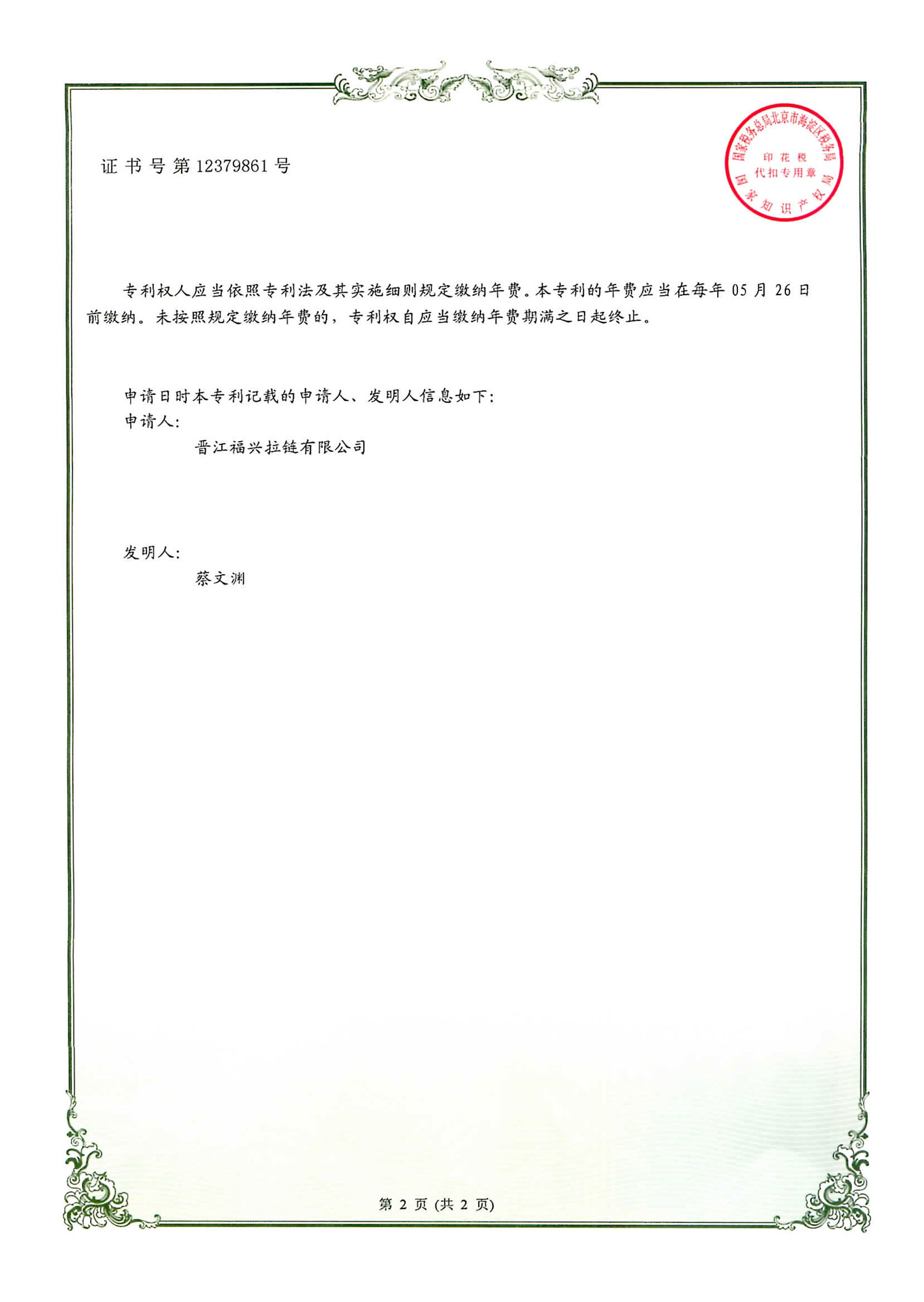 实用新型发明专利(第12379861号)